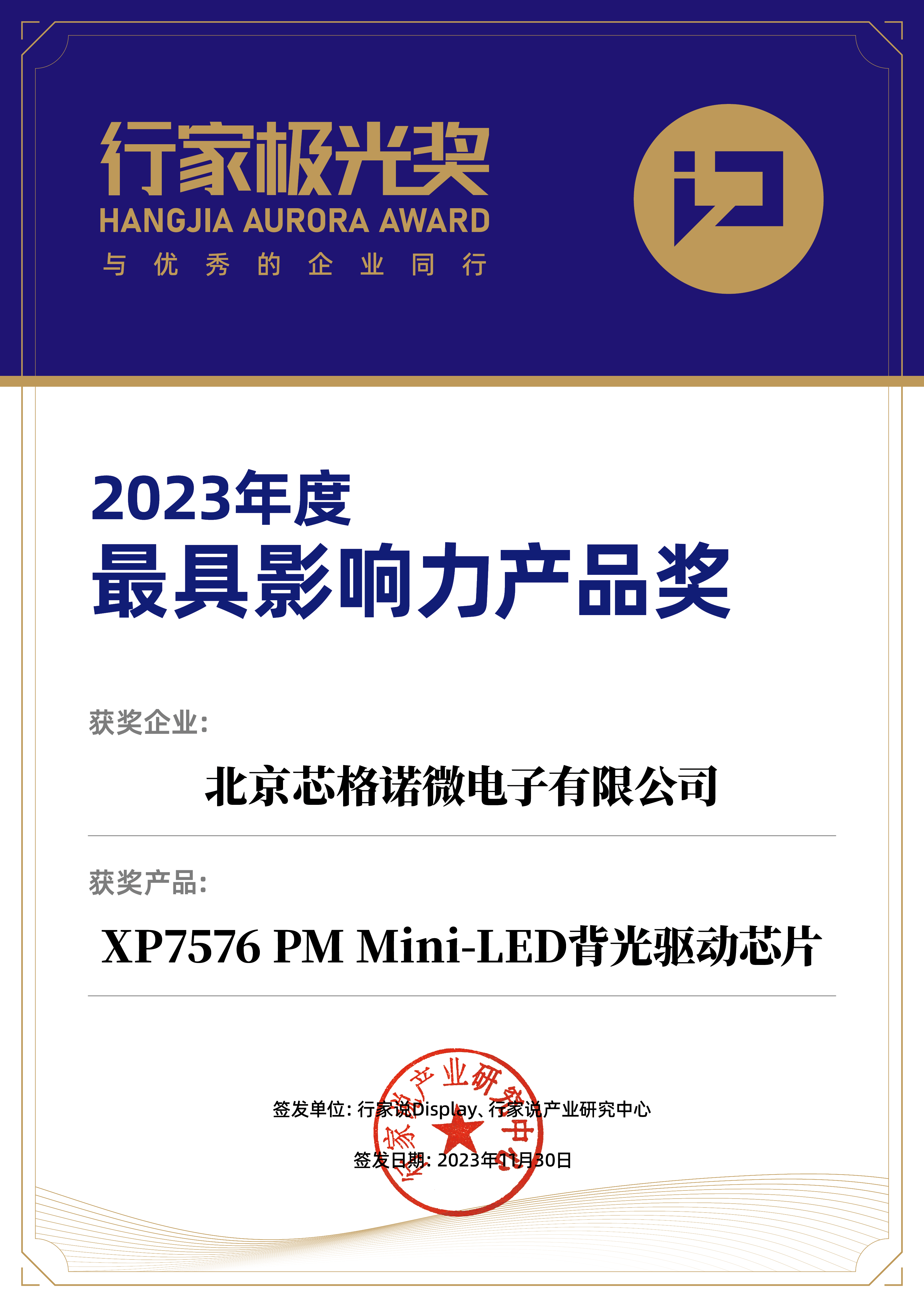 芯格诺荣获行家说Display极光奖,高性能PM背光驱动芯片获认可